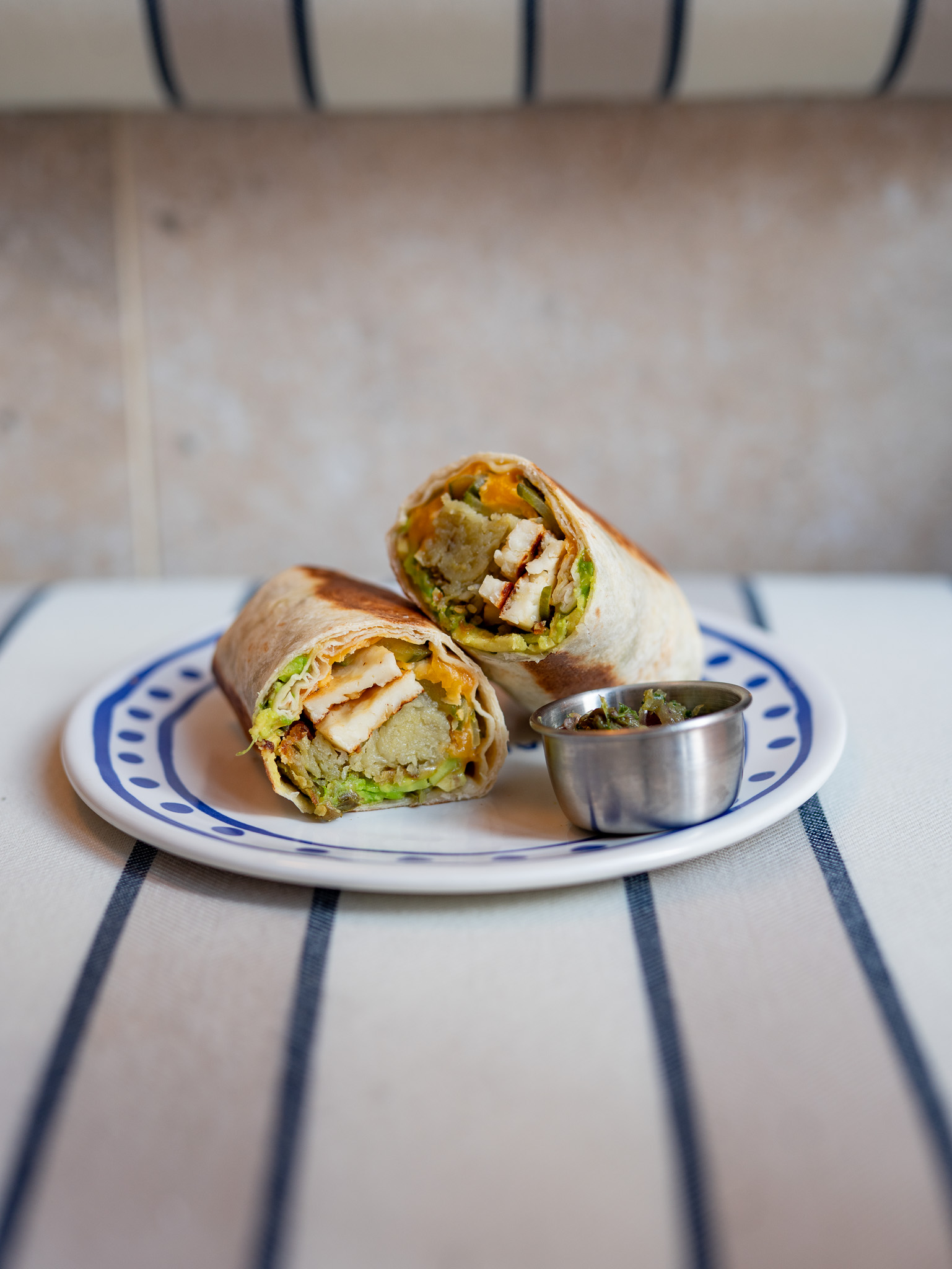 Galette de blé, Avocat tranché, Röstis de pomme de terre, Halloumi grillé, Cheddar rappé, Pickles de concombre, Condiment signature