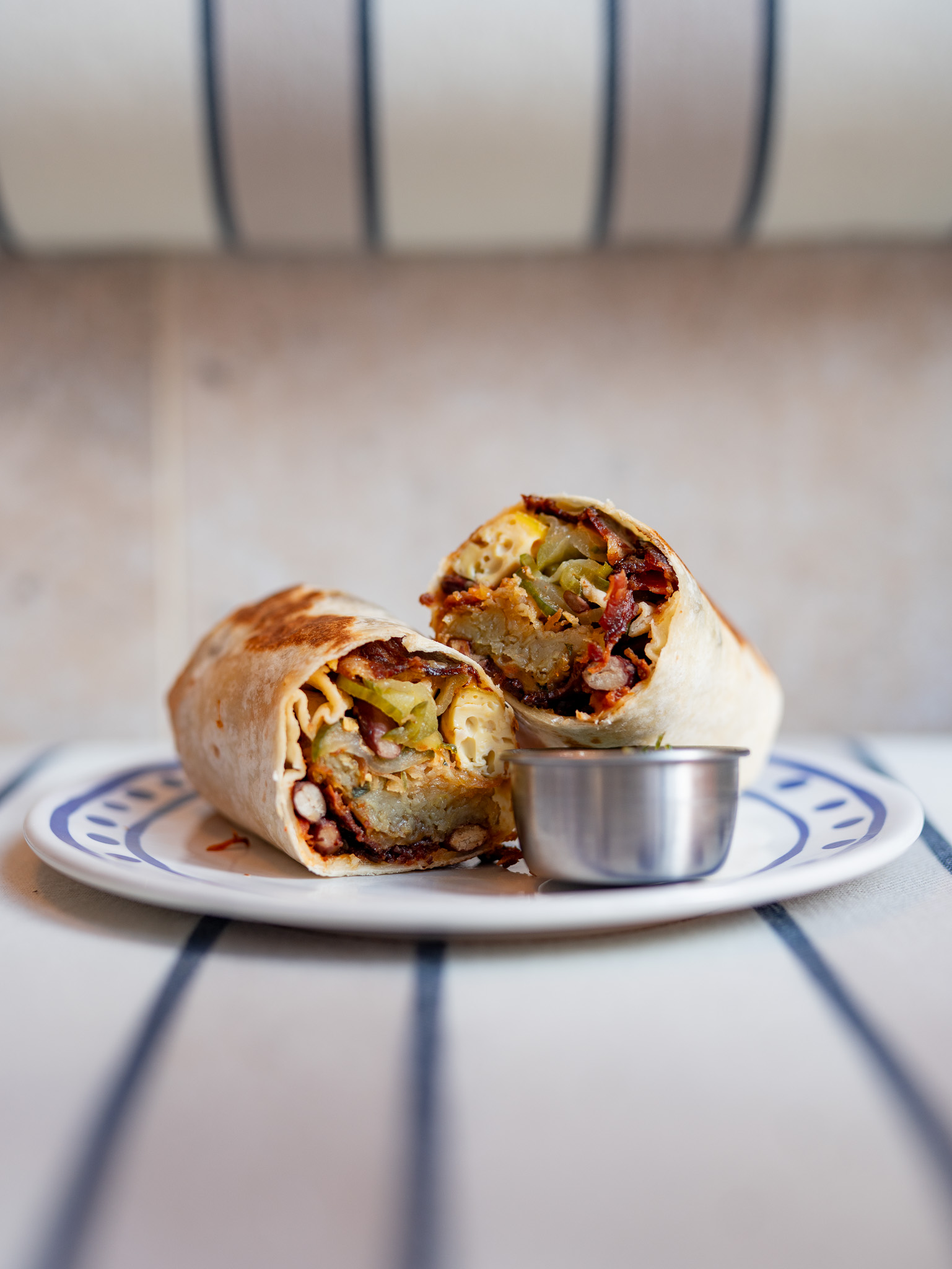 Galette de blé, Bacon fermier, Haricots rouges, Röstis de pomme de terre, Omelette, Cheddar rappé, Pickles de concombre, Condiment signature