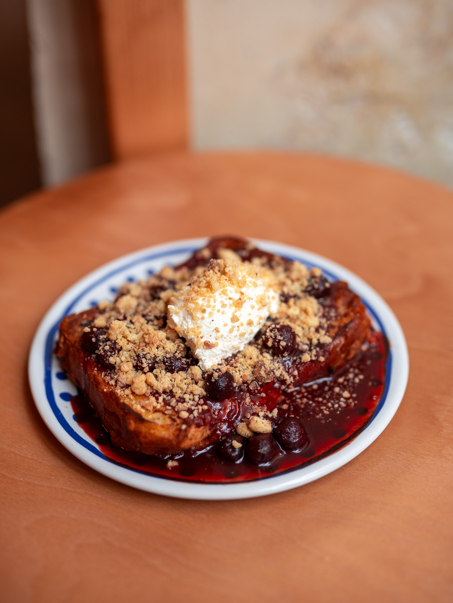 Pain perdu gourmand, Caramel de griottes, crème fouettée, Crumble d’amandes