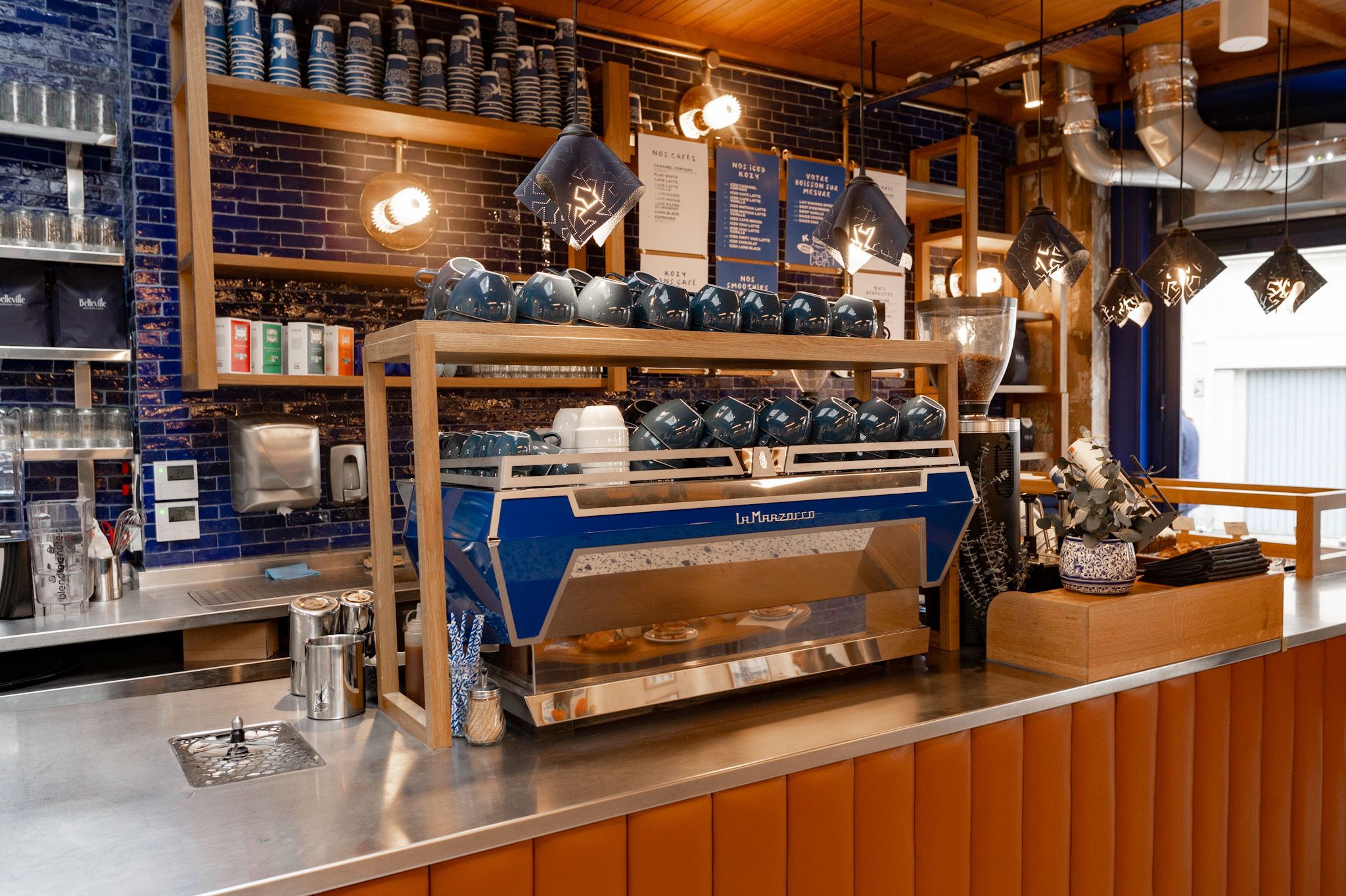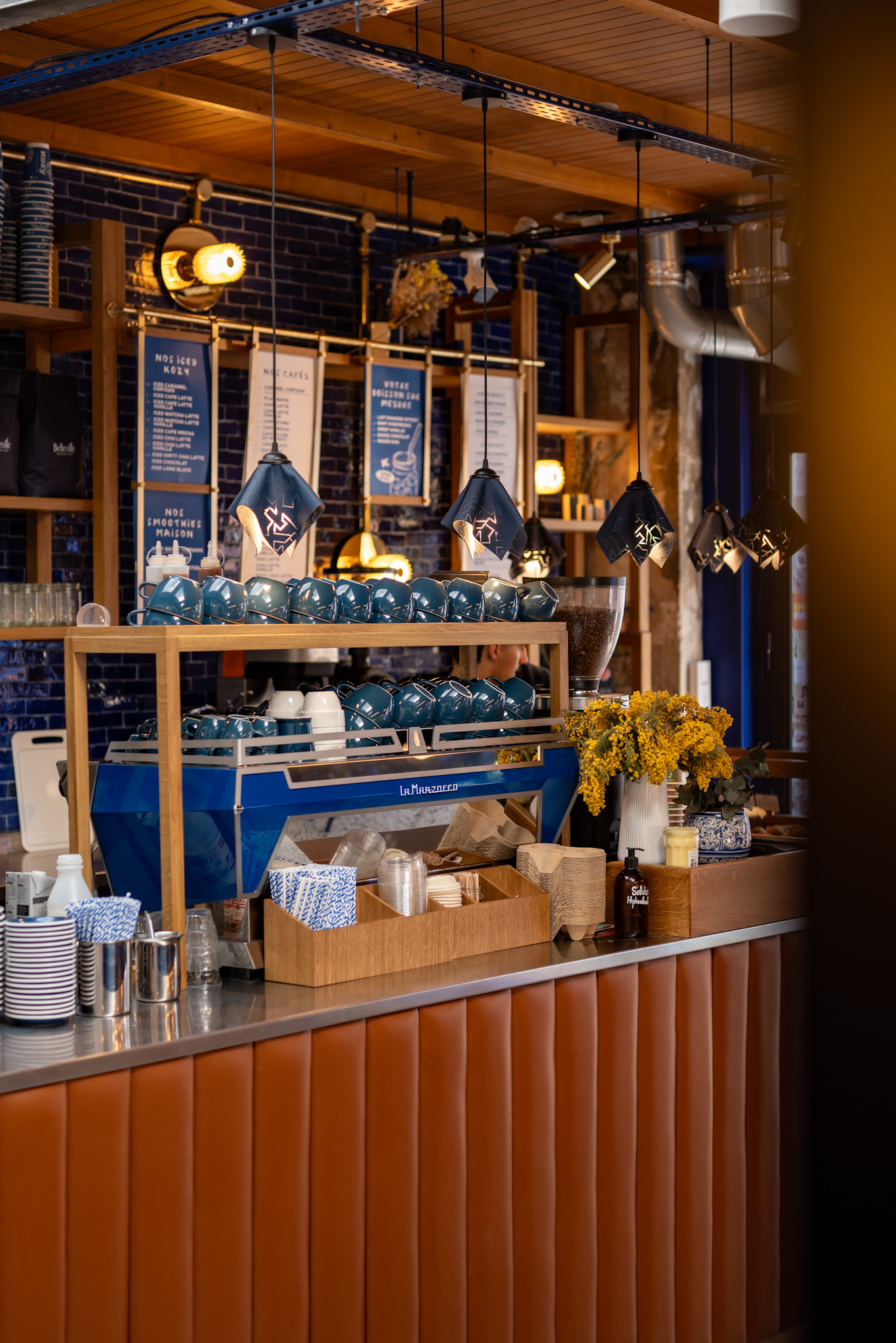 Façade bleu iconique, sols en terrazzo ponctués de verre coloré, comptoirs habillés de cuir aux tons tabac : une esthétique élégante et intemporelle, pensée pour durer.